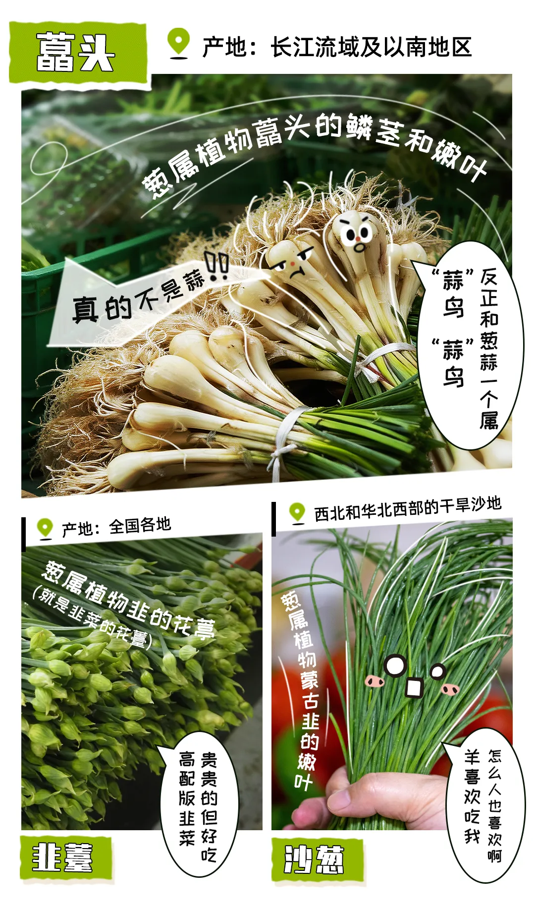 百合科葱属占据了调味类蔬菜的大半壁江山(葱、蒜、韭皆在此科),春季时令的葱属成员作为菜品主角也毫不逊色。藠头,是南方人一年一会的鲜香等待,鲜肉腊肉都等着为它做配;韭薹,取韭菜之精华鲜香而舍刺激辛辣,炒蛋炒肉包子饺子绝配;沙葱,羊和人都爱的鲜美“野草”,自然产量有限,价格上天(10元100克),尚且等待批量种植降至平价。