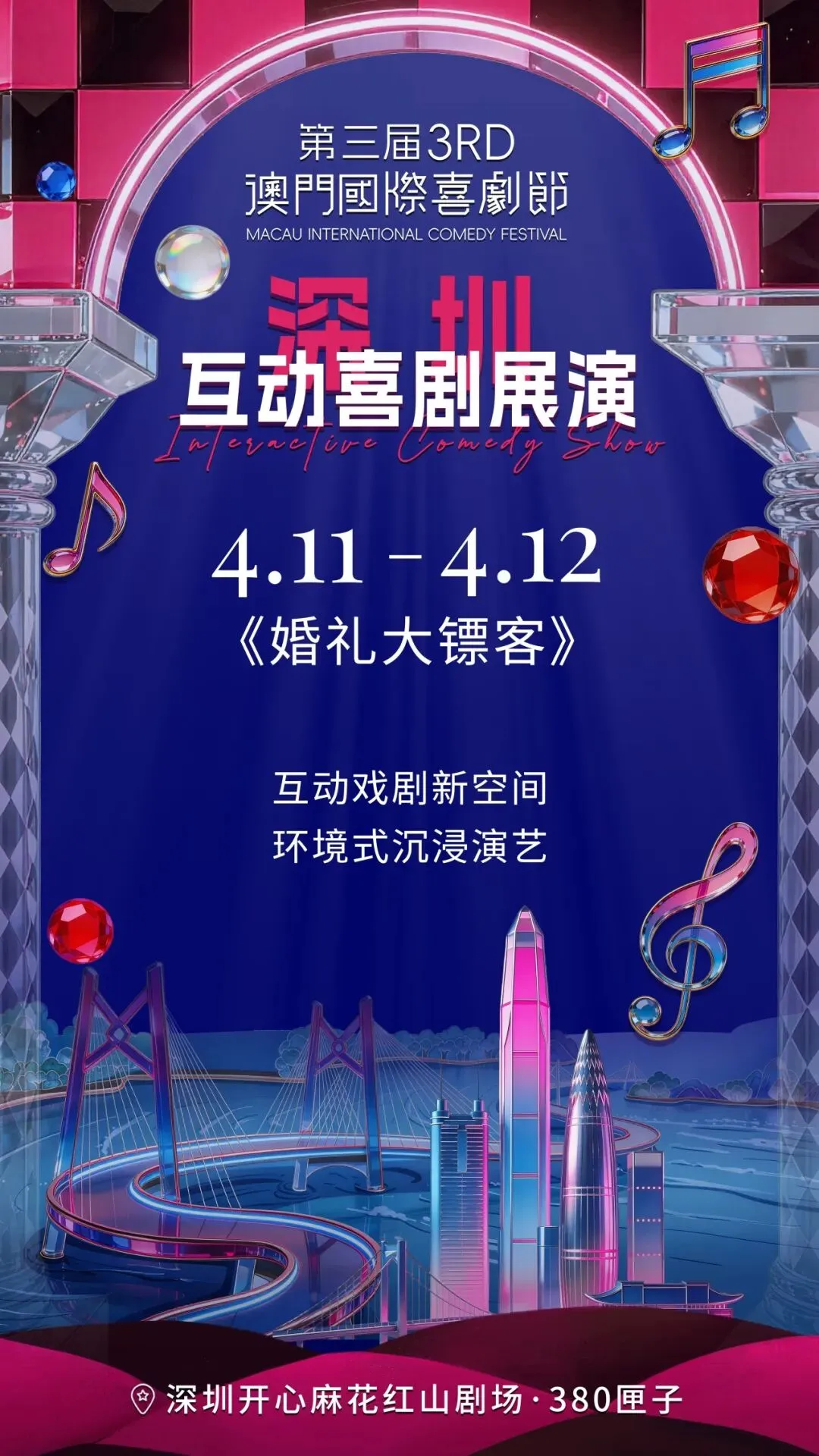 4月11日-12日,在深圳开心麻花红山剧场·380匣子观看《婚礼大镖客》,不仅能享受到精彩演出,还有机会获得第三届澳门国际喜剧节专属纪念周边!