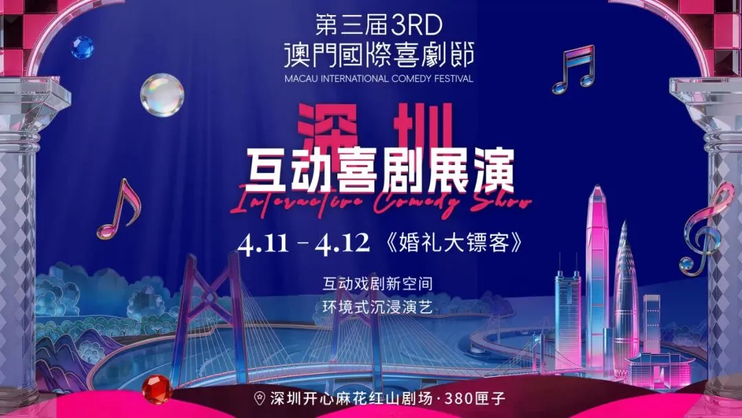 4月11日-12日,在深圳开心麻花红山剧场·380匣子观看《婚礼大镖客》,不仅能享受到精彩演出,还有机会获得第三届澳门国际喜剧节专属纪念周边!
