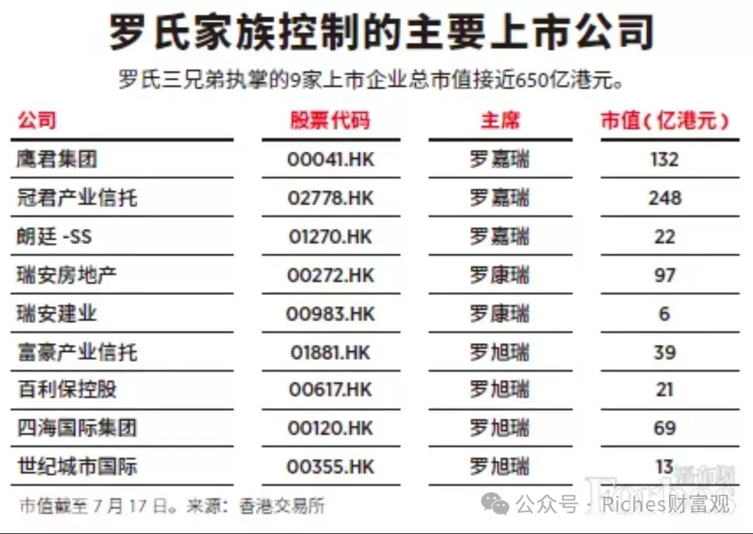 创始人罗鹰石白手起家打下地产江山,哪怕经历第二代兄弟反目、各立门户,却没让家族财富散架;第三代稳步接班、各展所长,最终手握 10 家上市公司,横跨地产、酒店、建筑三大领域,成为香港商界最具生命力的家族之一。