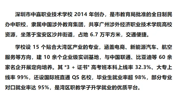 深圳市中嘉职业技术学校是深圳市教育局批准的全日制中等职业技术学校,是政府指定的广东省安全生产培训与考核基地、全国注册会计师考试考点、全国基金从业资格考试考点,是市政府重点发展的职业技术学校。