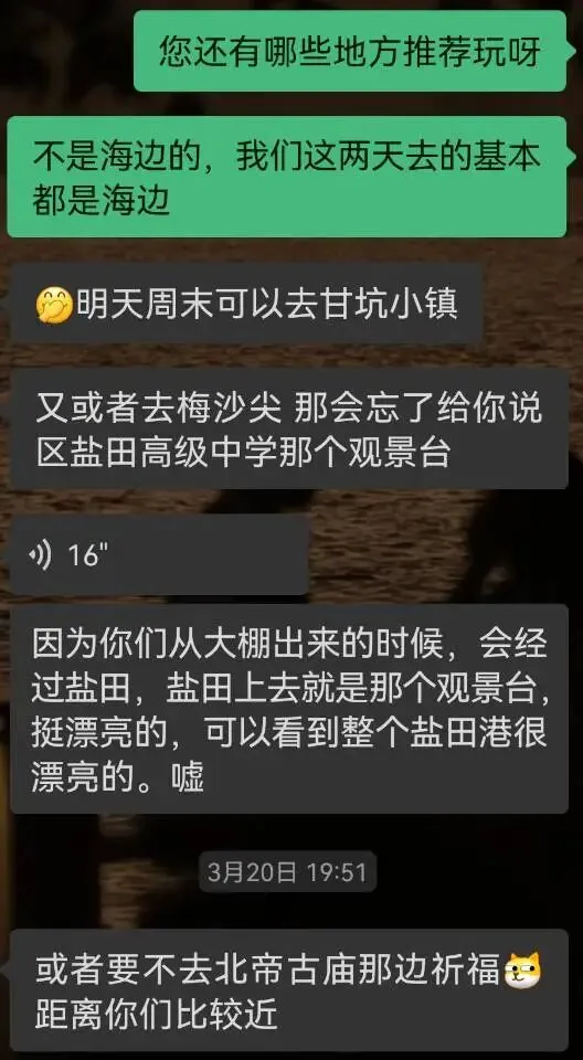 当得知我目前是刚结束一段工作所以出来旅游散心时,他给了许多我工作上的建议并拿身边优秀的同事朋友举例子告诉我们俩拼搏的重要性。临下车时,我们添加了他的微信,他会把给我们拍的照片整理好发过来。他还让我们关注他的抖音账号,后续他的一些作品也会发到抖音上,我们可以看看。