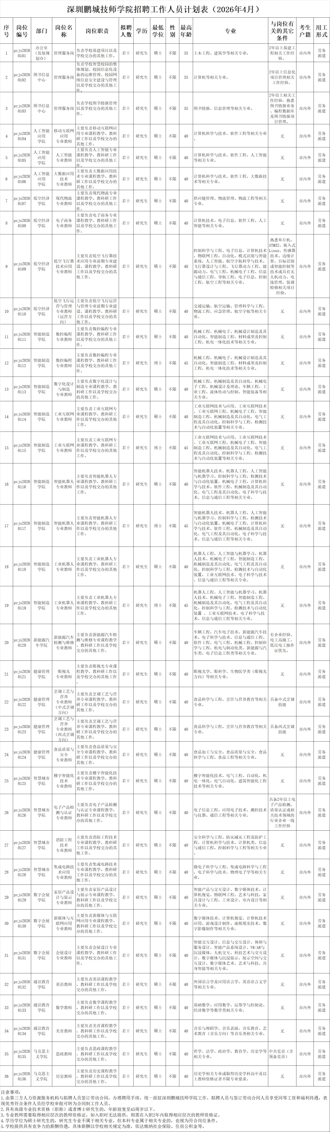 见附件《深圳鹏城技师学院招聘工作人员计划表(2026年4月)》(以下简称《计划表》)。