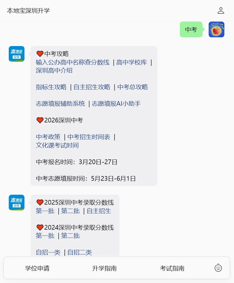 长按下方二维码,进入【本地宝深圳升学】回复【中考】获取往年各批次录取分数线、高中学校库、指标生+自主招生等中考指南