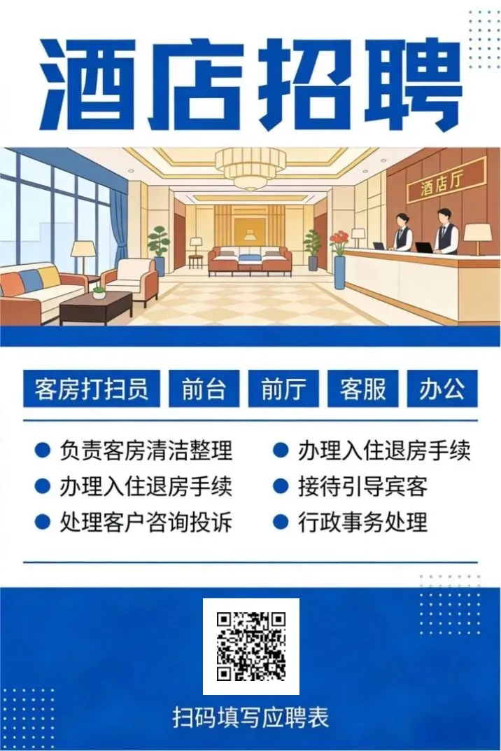 负责客房清洁、布草整理、房间保洁、公区协助、宴会帮工、后勤杂工,简单好做,多劳多得,工资准时不拖欠,包吃包住。