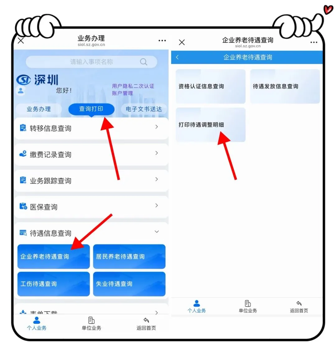 刷脸登录“深圳社保”,点击底部“掌上办”,再点开“业务办理”,找到“查询打印”,“企业养老待遇查询”,再找到“打印待遇调整明细”,点开就是自己2025年7月的调整明细表了: