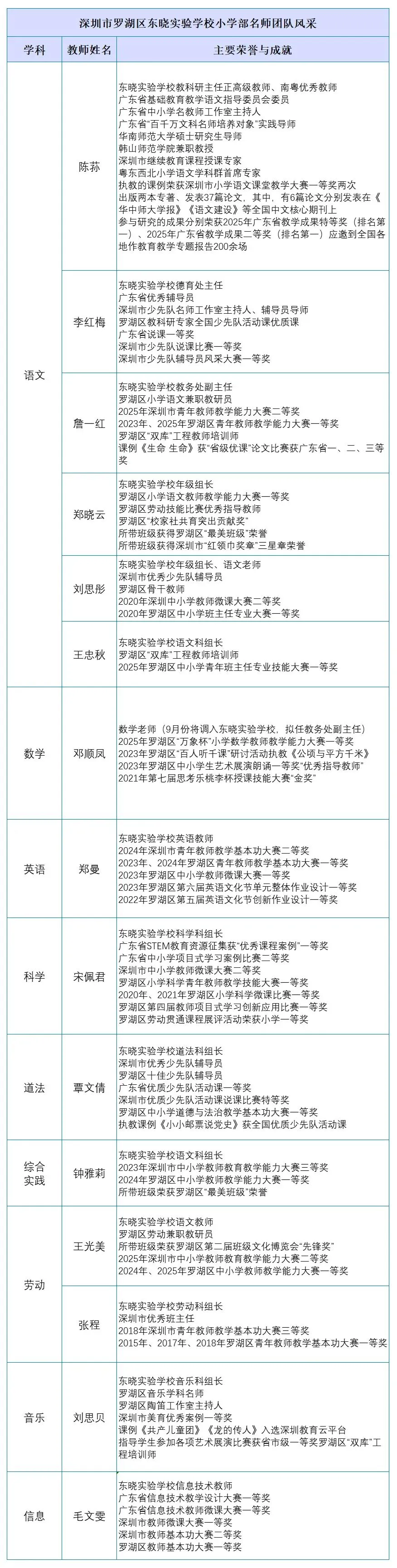 深圳市罗湖区东晓实验学校小学部师资实力强劲,骨干覆盖全学科,拥有正高级教师、南粤优秀教师、省名教师工作室主持人等高层次人才,及市区级优秀班主任、学科带头人数十名。教师教学竞赛成绩突出,累计斩获广东省教学成果特等奖、市区级教学基本功/教学能力大赛一等奖、省级优课、全国优质少先队活动课等核心专业荣誉,教研成果丰硕,为小学段教学质量提供充分保障。