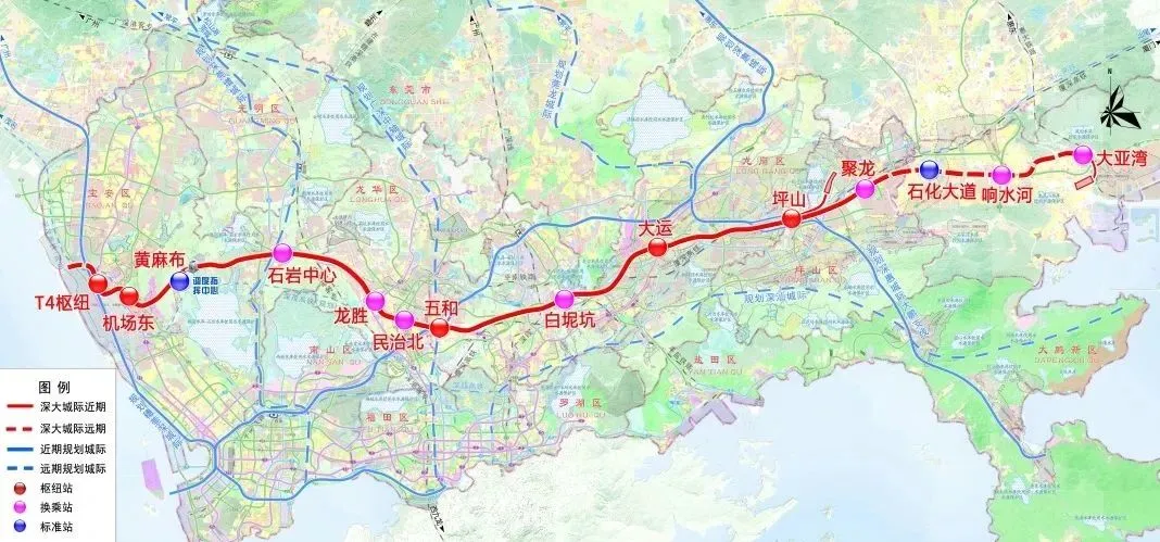 深大城际(深圳段)起自 📍 深圳市宝安机场T4站,途经宝安区、龙华区、龙岗区,终至 📍 坪山区聚龙站,线路全长约 69.2 km。线路设计时速为160km。