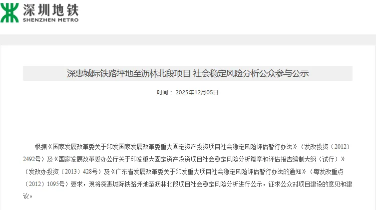 深圳市地铁集团有限公司12月5日发布《深惠城际铁路坪地至沥林北段项目社会稳定风险分析公众参与公示》。