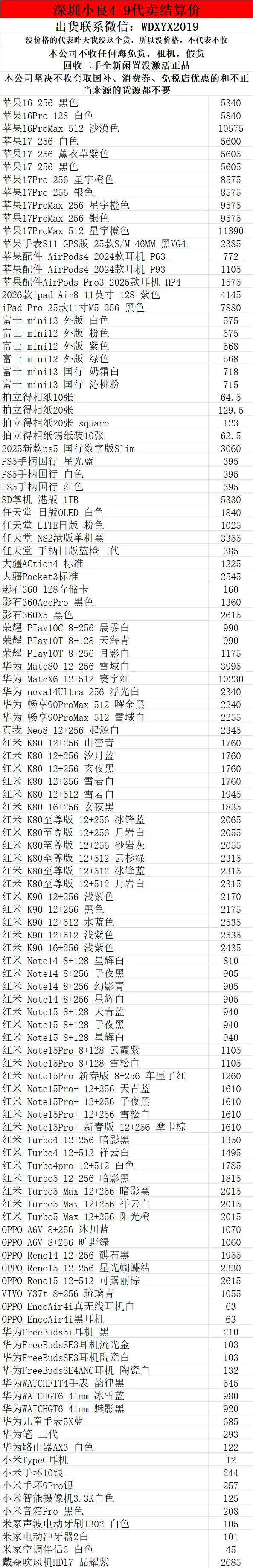 >深圳小良2026.4.9电子产品代卖结算价(美妆价格小程序查看)