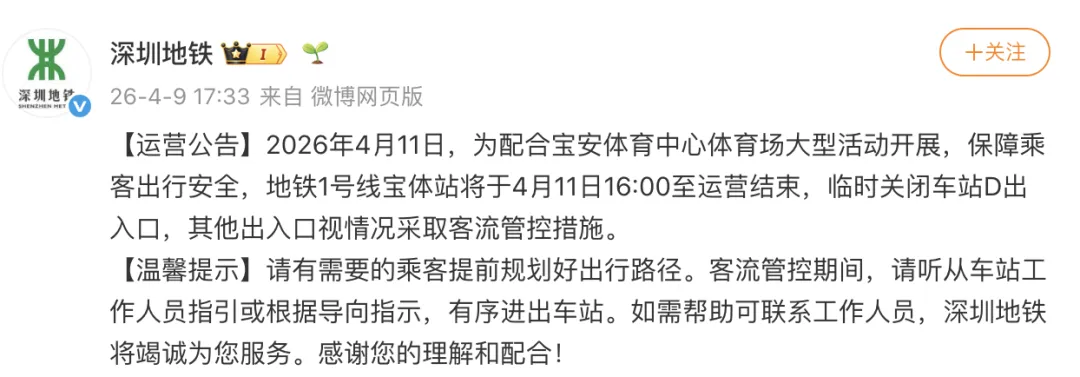 2026年4月11日,为配合宝安体育中心体育场大型活动开展,保障乘客出行安全,地铁1号线宝体站将于4月11日16:00至运营结束,临时关闭车站D出入口,其他出入口视情况采取客流管控措施。