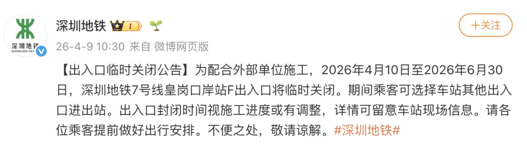 为配合外部单位施工,2026年4月10日至2026年6月30日,深圳地铁7号线皇岗口岸站F出入口将临时关闭。期间乘客可选择车站其他出入口进出站。出入口封闭时间视施工进度或有调整,详情可留意车站现场信息。请各位乘客提前做好出行安排。不便之处,敬请谅解。