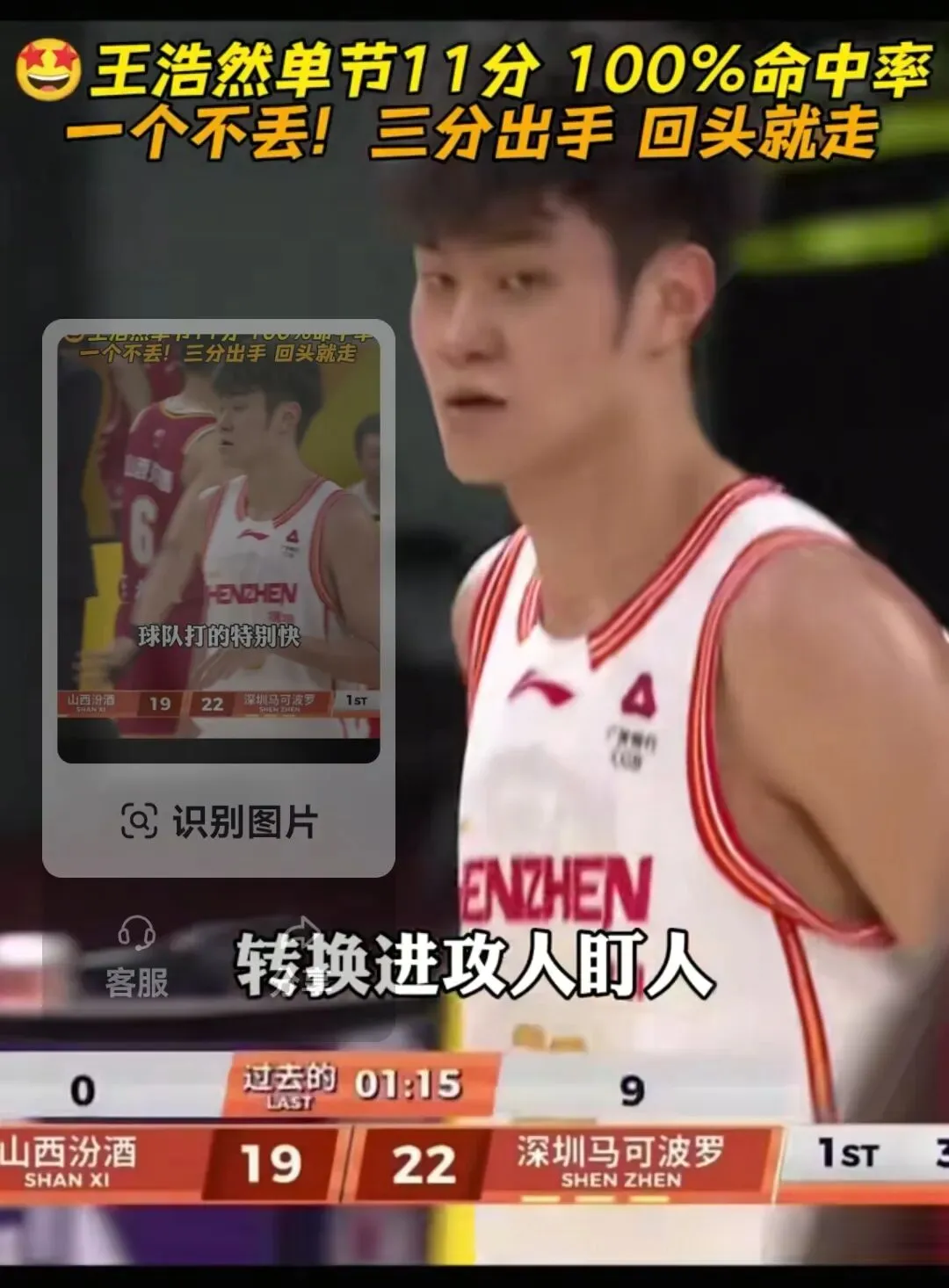 比赛全程,王浩然就是深圳的“关键先生”。开局深圳陷入被动,他里突外投连砍8分,带队直接反超比分。