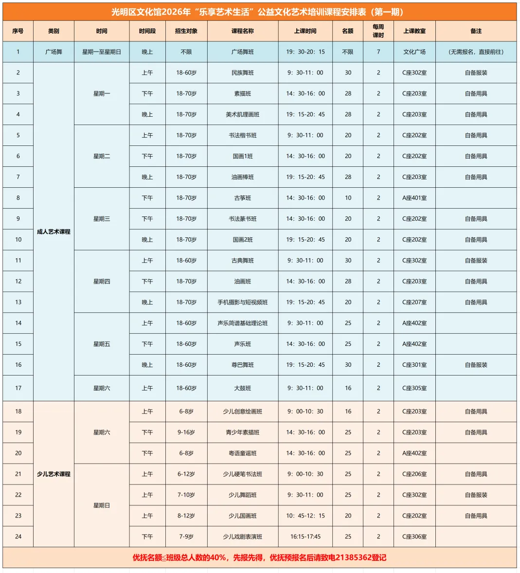 5.报名未达到核定开课人数的课程,或遇到不可抗力因素,光明区文化馆将酌情调整课程项目及时间。