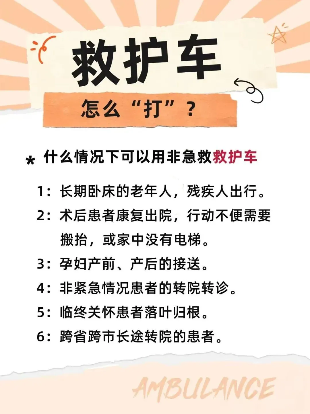 我们专注非急救医疗转运,覆盖 120 非急救转运、长途 / 跨省病人转运等全场景,承接新生儿、骨折患者、重症患者、行动不便者复查转院、跨省返乡、遗体转运等各类需求,以专业设备与团队,全程保障安全、稳妥、贴心。