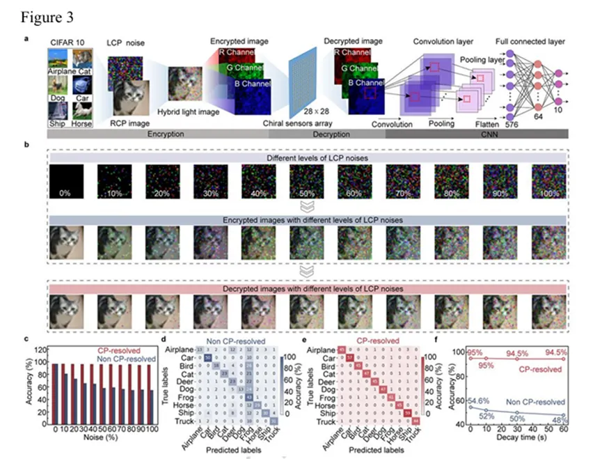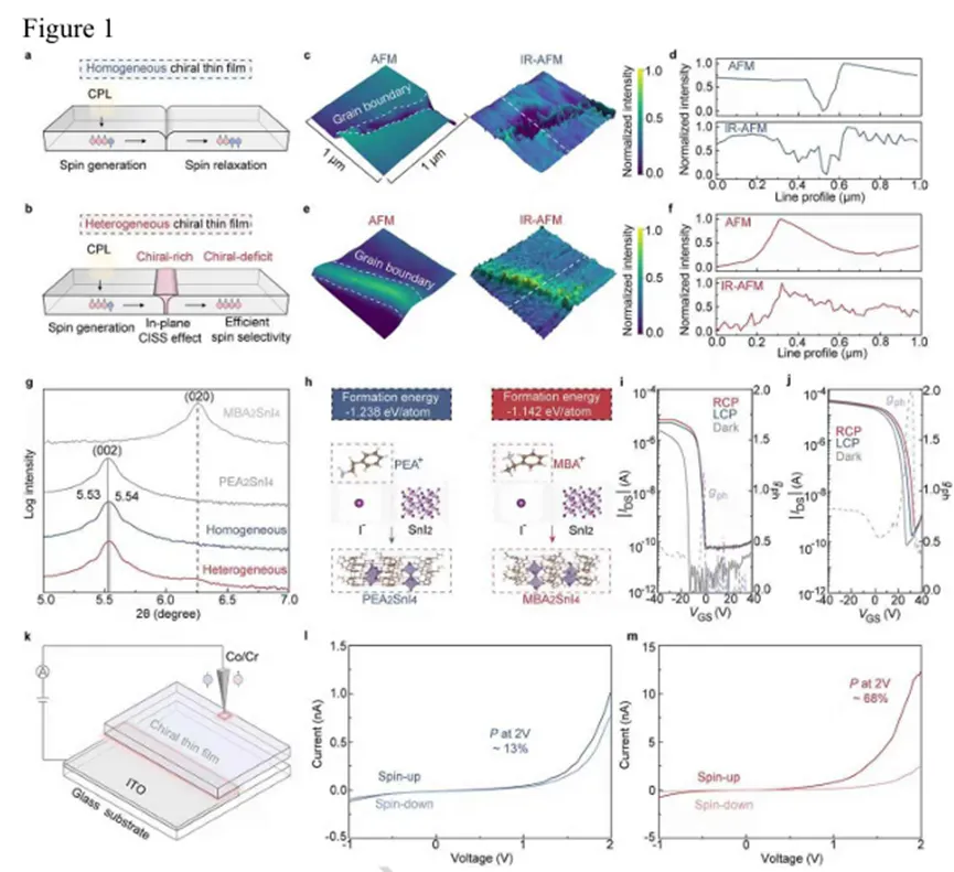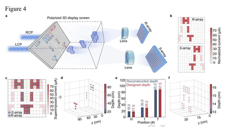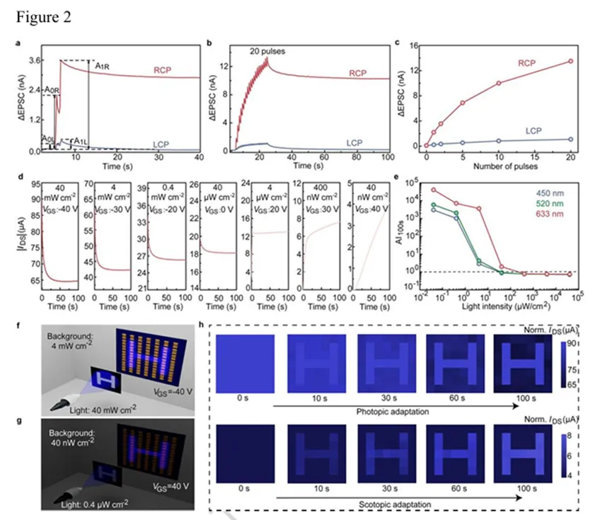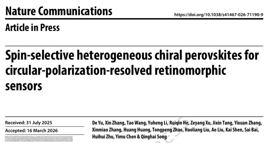 第一作者:De Yu、Xin Zhang(共同第一作者)通讯作者:Tao Wang、白赛、沈凯、朱慧慧、陈怡沐、宋清海单位:哈尔滨工业大学(深圳)集成电路科学与工程学院、广东省半导体光电子材料与智能光子系统重点实验室;河南大学物理与电子学院;香港科技大学(广州)可持续能源与环境学域;复旦大学材料科学系;电子科技大学基础与前沿研究院、物理学院圆偏振分辨视网膜模拟传感器作为下一代人工视觉系统的核心硬件,有望拓展感知能力并提升抗干扰性,但由于缺乏同时具备高不对称圆偏振响应与多重仿生功能的手性材料,其发展受到限制。本研究报道了一种手性钙钛矿自组装异质微结构,由手性缺陷晶粒和手性富集晶界组成,可同时实现自旋选择性与优异光电性能,适用于高不对称、多功能圆偏振分辨视网膜模拟传感器。该传感器不仅展现出高达 1.98 的光电流不对称因子和全色圆偏振分辨响应,还具备模拟人类视网膜的多重仿生功能,包括突触行为、光适应和颜色识别。作为概念验证,研究分别展示了单圆偏振手性分辨传感器阵列在信息加密中的应用,以及双圆偏振手性分辨双目传感器阵列在虚拟立体重建中的应用。1. 创新异质微结构设计,突破性能权衡瓶颈:提出通过非化学计量比策略构建手性钙钛矿异质结构((R-MBA₀.₂PEA₀.₉)₂SnI₄),实现手性富集晶界与手性缺陷晶粒的自组装分布。手性富集晶界(手性分子浓度为晶粒内部的 3-5 倍)可桥接相邻晶粒、钝化缺陷以促进跨晶粒载流子传输,同时作为面内自旋阀实现高效自旋选择;晶粒部分保持良好结晶质量以保障光电性能,解决了传统手性钙钛矿中“高自旋选择性与优异光电性能难以兼顾” 的关键问题。2. 圆偏振分辨性能卓越,接近理论极限:异质结构传感器的光电流不对称因子(gₚₕ)高达 1.98,接近 2.0 的理论极限,远优于均质结构传感器(gₚₕ仅 0.3 对应的不对称水平)。磁导电探针原子力显微镜(mCP-AFM)证实,异质结构的自旋极化效率达 68%(2 V 时),是均质结构(13%)的 5倍以上;且得益于手性诱导自旋选择性(CISS)效应的波长不敏感性,传感器实现 450-633 nm 全色圆偏振分辨,峰值 gₚₕ均超过 1.9。3. 多重仿生功能集成,模拟视网膜特性:基于锡基二维钙钛矿的电子 / 离子传输特性,传感器集成多种视网膜仿生功能:o 突触行为:具备短 / 长时可塑性,成对脉冲易化(PPF)指数达 185%,单事件能耗低至0.2 pJ,接近生物突触水平;o 光适应:可在 40 nW/cm²-40 mW/cm² 的宽光强范围实现明 / 暗适应,适应指数(AI₁₀₀ₛ)最低 0.72(明适应)、最高4×10⁴(暗适应),与人类视网膜适应范围相当;o 颜色识别:对红(633 nm)、绿(520 nm)、蓝(450 nm)光的识别准确率分别达 99%、95%、99.9%。o 信息加密:7×7 传感器阵列可从 100% 左旋圆偏振(LCP)噪声干扰中精准提取右旋圆偏振(RCP)加密信息,解密后图像经卷积神经网络(CNN)识别准确率达 95%,远超均质结构传感器(54.6%);o立体重建:12×12双目传感器阵列(分别识别RCP/LCP)可实现 “Hit” 图案的虚拟立体深度重建,重建深度与设计值平均误差仅 3%,为沉浸式人机交互提供核心硬件支持。D. Yu, X. Zhang, T. Wang, Y. Li, R. He, Z. Xu, J. Tang, Y. Zhang, X. Zhang, H. Huang, T. Zhao, H. Liu, A. Liu, K. Shen, S. Bai, H. Zhu, Y. Chen, Q. Song, Spin-selective heterogeneous chiral perovskites for circular-polarization-resolved retinomorphic sensors, Nat. Commun., 2026, https://doi.org/10.1038/s41467-026-71190-9.