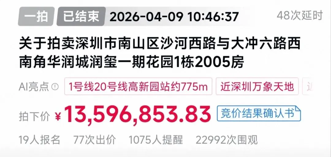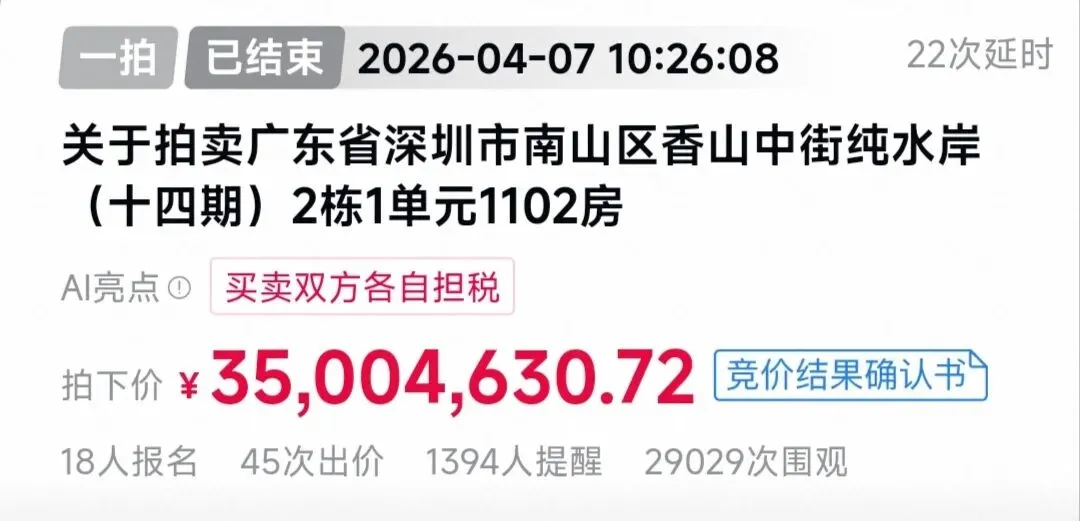 继3月刚需集中放量后,不少业主拿到了卖房款,有改善型需求的买家正在积极入场。数据显示,4月第一周,深圳总价800万以上二手房源成交占比大幅提升。其中,800-1000万房源成交占比环比涨了4.2%,1500万以上房源也涨了1.6%。如半岛城邦三期,上周连续成交了两套160平5房,一套中高层以2520万成交,另一套高层以2530万成交。4月9日,南山华润城润玺一期,一套121平的法拍房吸引了19位买家,经过77轮出价,最终以1359.6万成交。该小区2020年的开盘价约13.2万/㎡,120平户型近期二手房成交价大概在1500万左右,单价12万。不过,原业主是在2023年以1576万买入的,如今1359万法拍成交,账面上亏损15%左右。无独有偶。就在前两天,华侨城纯水岸十四期一套建面约301平的豪宅,经过18位买家、45次竞价,最终以3500万成交,溢价率高达132.5%。接连两场高热度法拍,都是位于南山核心地段,周边产业聚集,说明好资产依旧具有很强的市场共识。深圳买房置换,怕买错怕买贵?