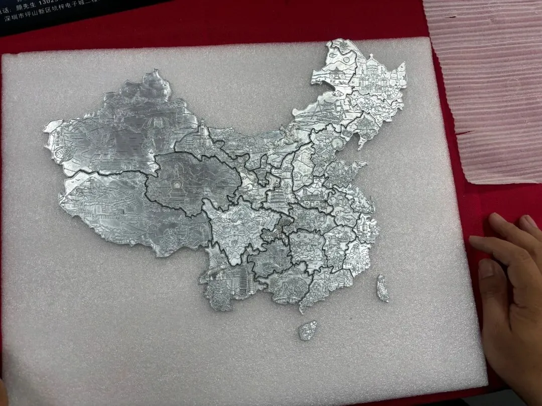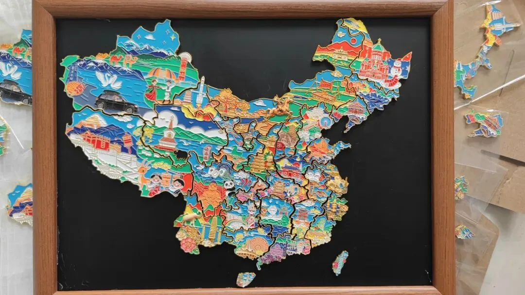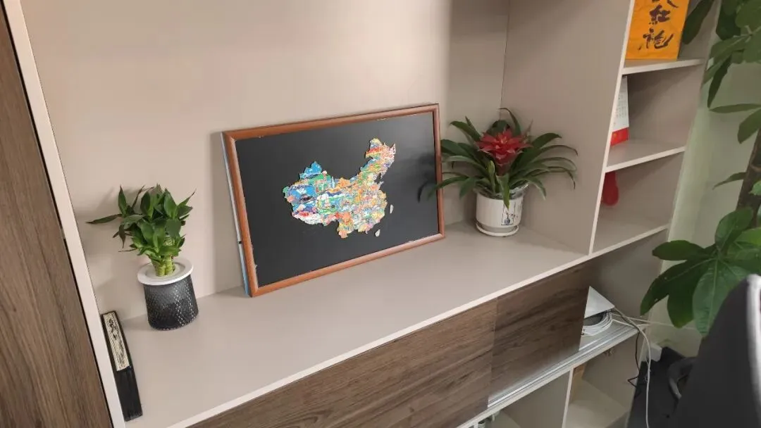 在他们所有的样品里,做成全国地图拼图的冰箱贴,只有我这一款,老板特意自己配了个磁吸框,放在他的办公桌后面,他说来到这里的很多人看了后都特别喜欢,想从他这里买一套,他说这是客户的还没开始卖,等开始卖了告诉他们。