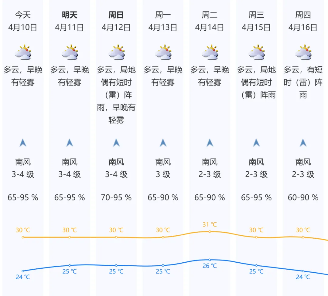 深圳今日多云,早晚有轻雾,气温24-30℃。