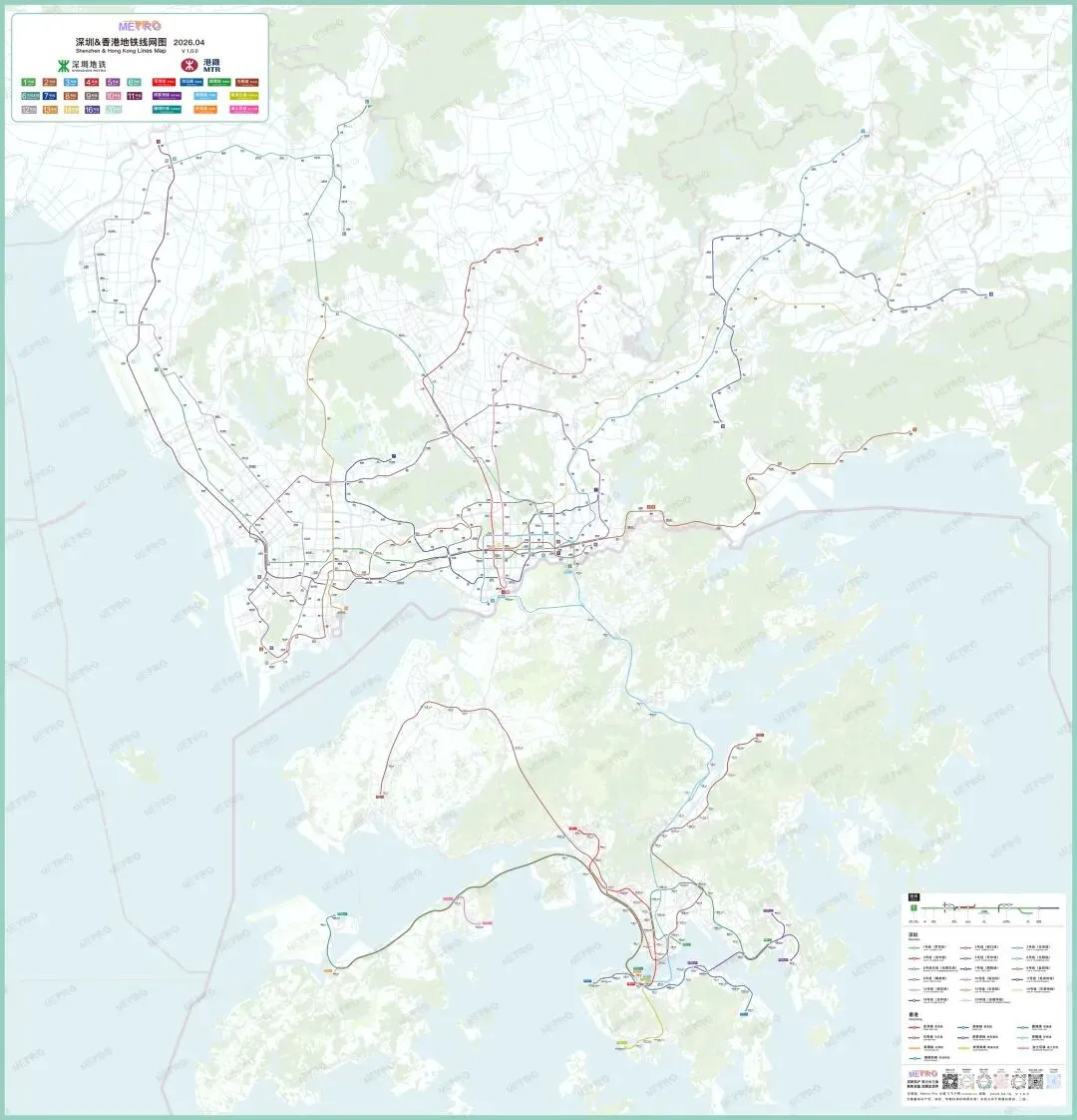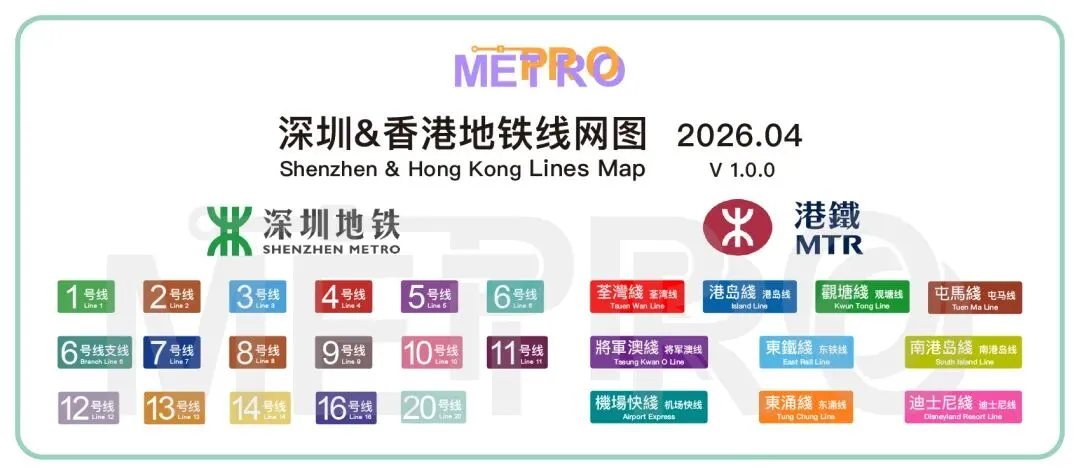 截至2026年04月,深圳地铁运营线路共17条,共设车站441座,其中换乘站65座,运营里程共计623.5km。香港港铁运营线路共10条,运营里程共237km;其中,市区线共设车站96座,运营里程共201.8km;机场快线共设车站5座(其中3座与港铁东涌线共用),运营里程35.2km。