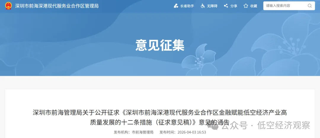 【低空经济动态】深圳前海金融赋能低空经济产业高质量发展十二条措施(征求意见稿)发布
