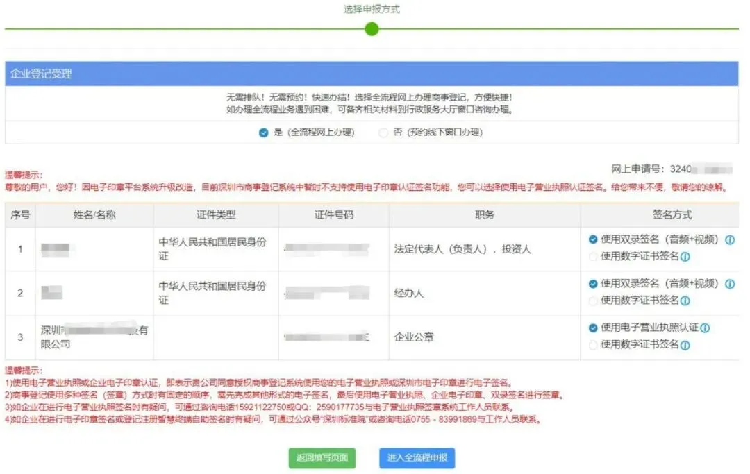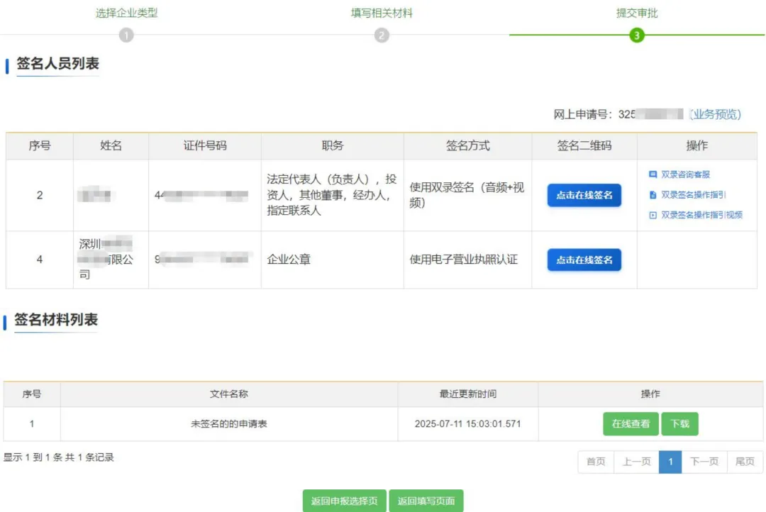 第二步(在线签名):经办人选择的在线签名方式(双录签名 、电子印章签名 、电子营业执照签名),进入“在线签名 ”页面,签名人员点击“在线签名”二维码进行在线签名,签名人员全部完成签名后,业务自动提交。如需修改申请 信息 ,点击“返回填写页面 ”,再次提交需重新实名认证 。如需重新选择签名方 式 ,点击“返回申报选择页面 ”。