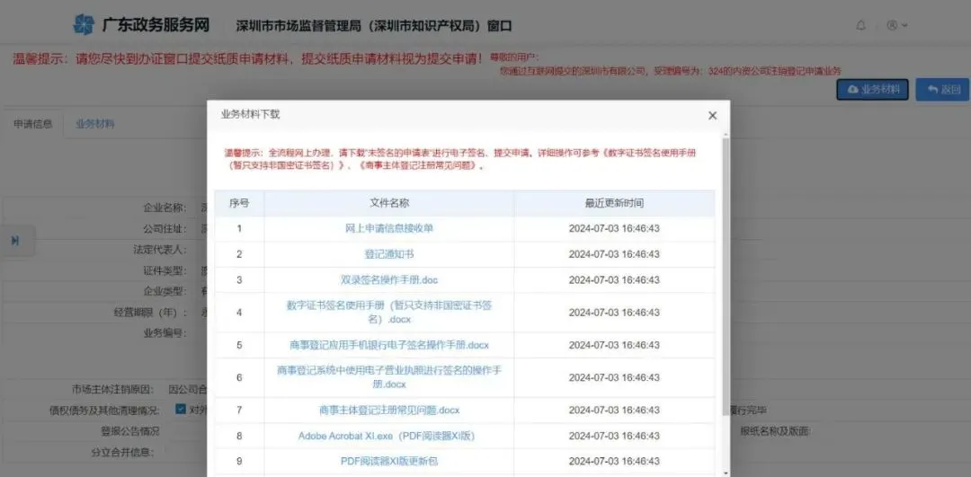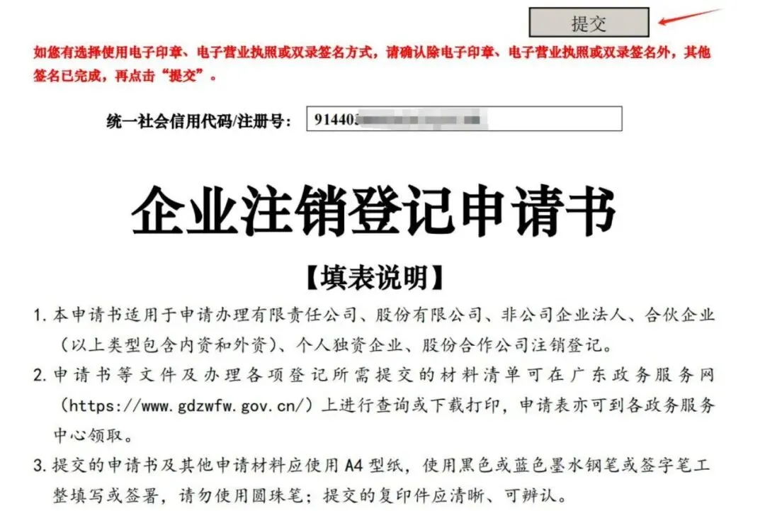(1) 商事登记使用多种签名(签章)方式时有固定的顺序 ,需先完成其他形式的电子签名 ,最后使用电子营业执照/电子印章签名 。(顺序:手机银行/智慧终端签名→数字证书签名→完成全部证书签名后点击PDF申请表第一页右上角的【提交】按钮→双录签名→电子营业执照/使用电子印章签名),详
