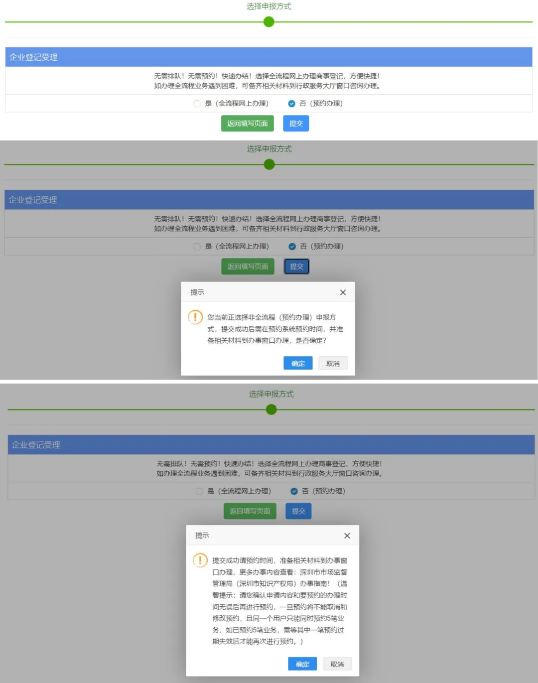 第一步:非全流程办理 ,选择“否(预约办理) ”, 点击“提交 ”。