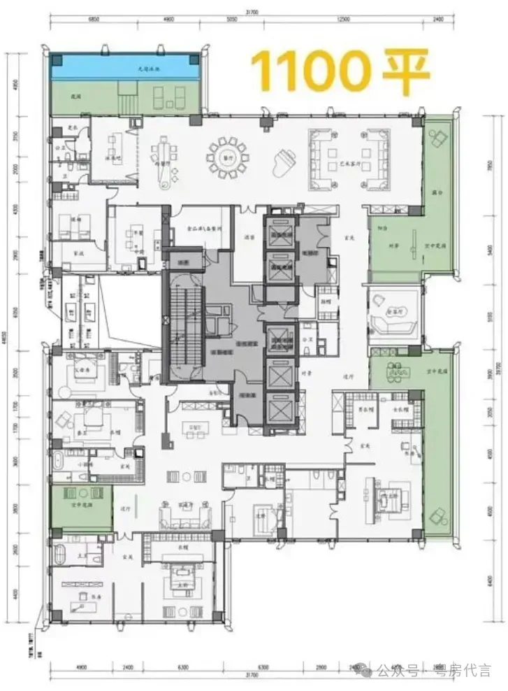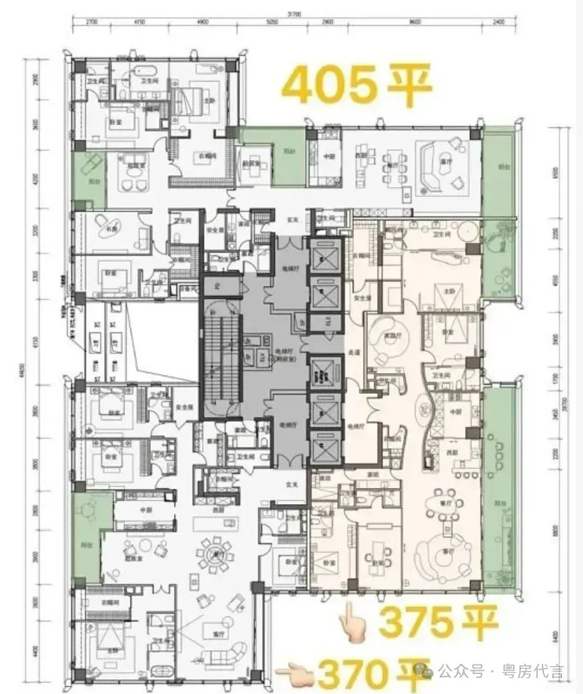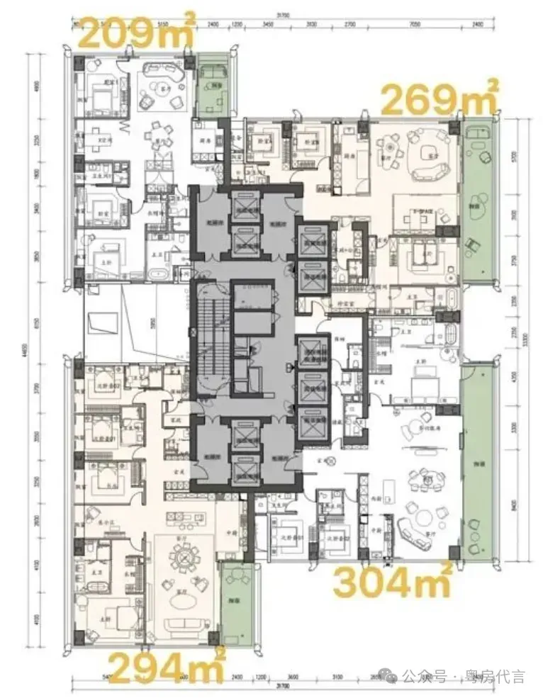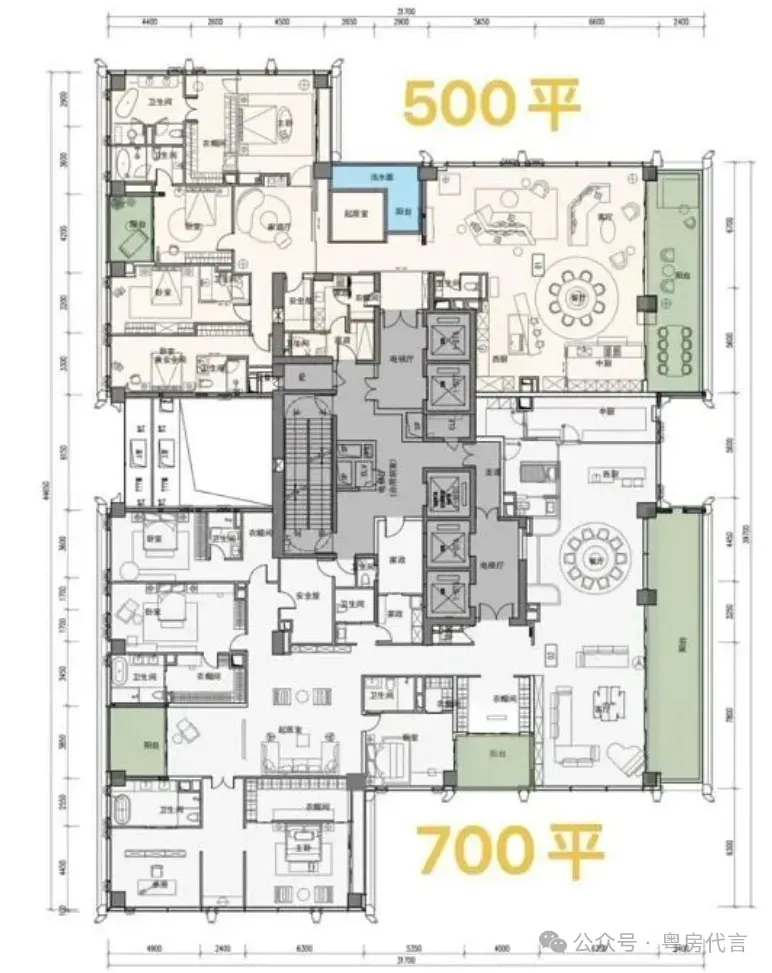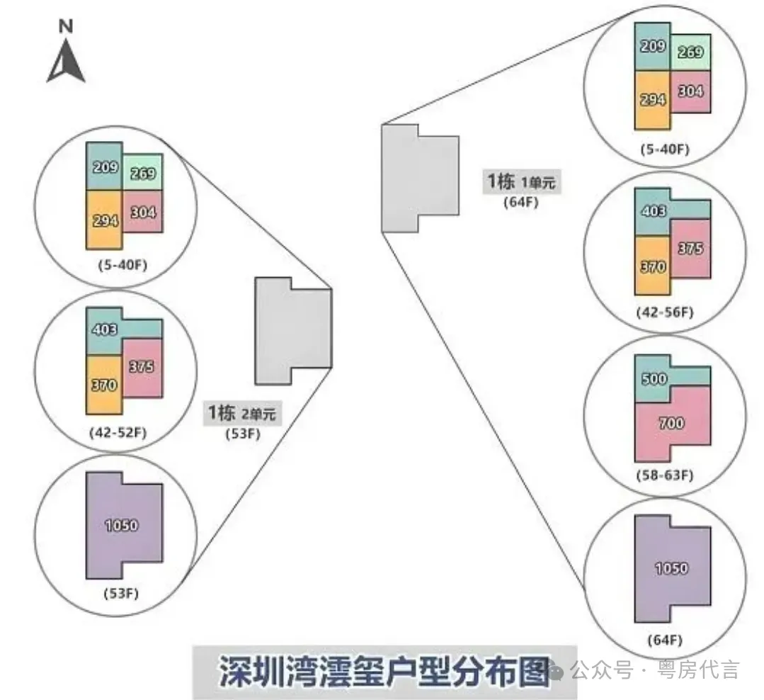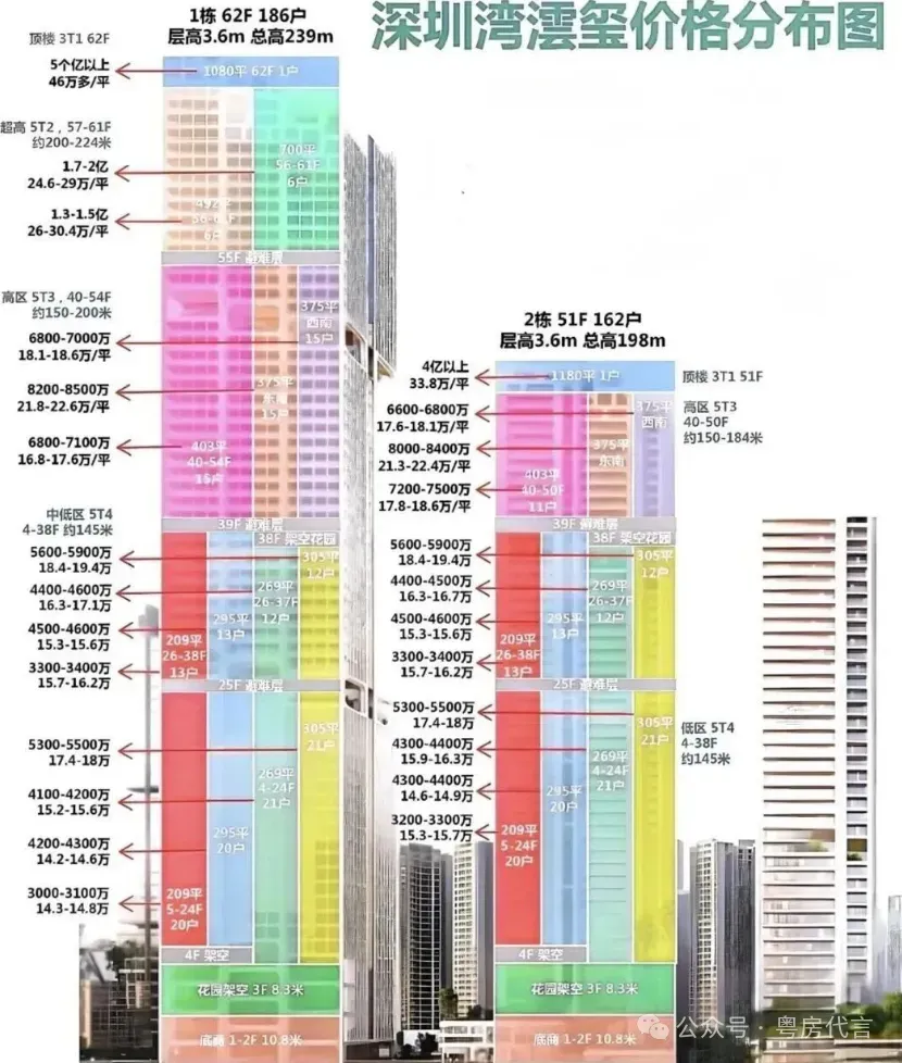 - 户型设计:户型面积跨度约209-1150㎡,涵盖四房、五房及复式户型。主力户型采用“框架核心筒+无次梁厚板”结构,空间灵活可变,层高约3.6米,配备大面宽阳台,部分户型可享270°海景或城市天际线景观。