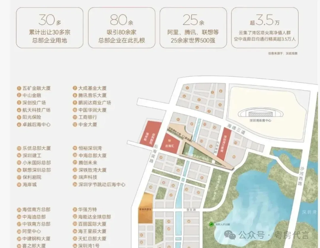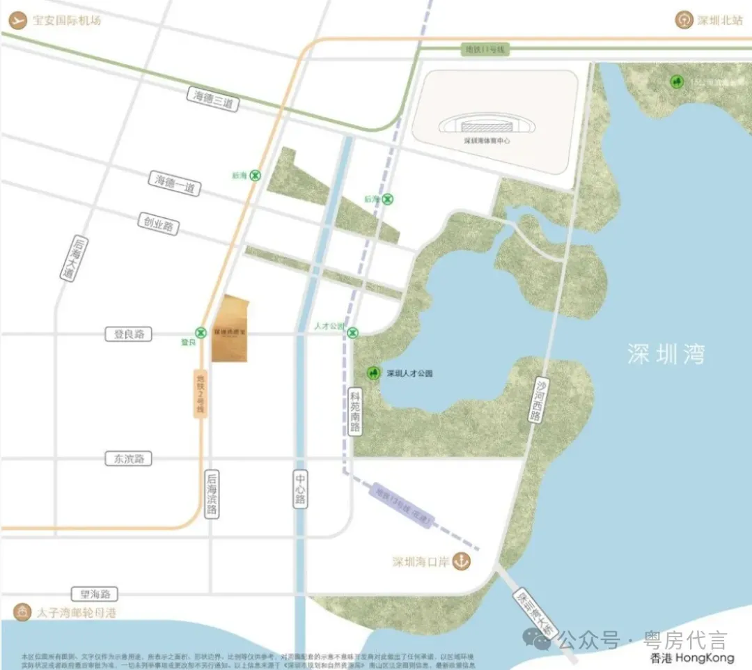 - 位置:深圳市南山区深圳湾后海总部基地,紧邻深圳人才公园、深圳湾文化广场,与深圳湾体育中心、深圳湾万象城等商业体相邻。