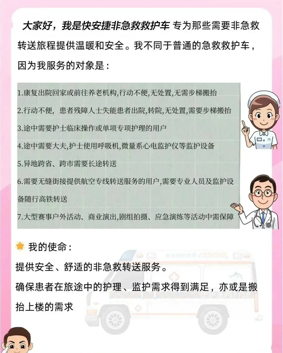 - 24小时全天候服务,全年无休,随时响应紧急转运与预约转运;- 价格公开透明,无隐形消费,根据转运距离、车辆配置合理定价; 市内短途(出院 / 转院)普通转运:600–800 元起(含 10 公里内);超出后8–10 元 / 公里监护型(含医护 / 基础设备):800–1200 元起附加:进高铁站 / 火车站 +200 元 长途跨省(按里程)重症监护(呼吸机 / 医护):10–18 元 / 公里- 正规资质保障,车辆与人员均符合医疗转运标准,手续齐全,安全可信赖;- 服务灵活贴心,可根据患者病情定制个性化转运方案,全程人性化陪护预约与联系