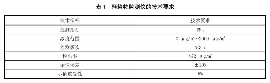 颗粒物监测仪基于光散射原理,对采样颗粒物进行测量,采样点和对照点使用的颗粒物监测仪应一致,相关技术指标应符合表1的要求。在满足相关技术指标要求时,可选用其他原理的颗粒物监测仪。