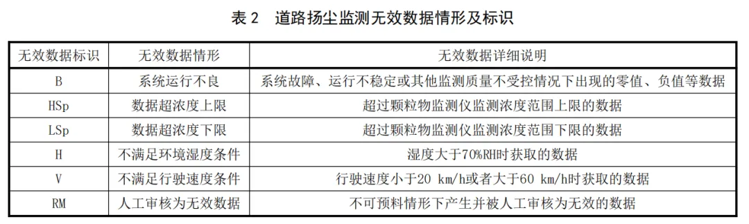 道路扬尘车载移动监测系统正常运行及满足操作要求时获取的数据为有效数据,无效数据情形及标识见表2,应在道路扬尘监测数据储存文件中的采样点PM10浓度、对照点PM10浓度和道路扬尘浓度值旁边括号内显示无效数据标识。