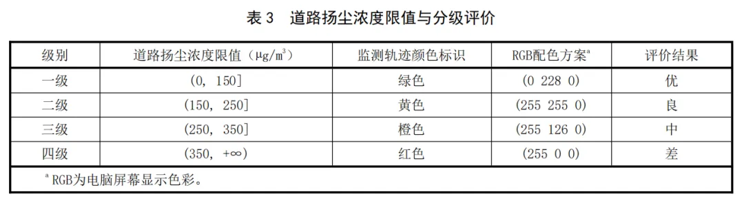 将道路扬尘浓度从低到高划分为四种级别,各级别对应的道路扬尘浓度限值、监测轨迹颜色标识和评价结果应符合表3的规定。