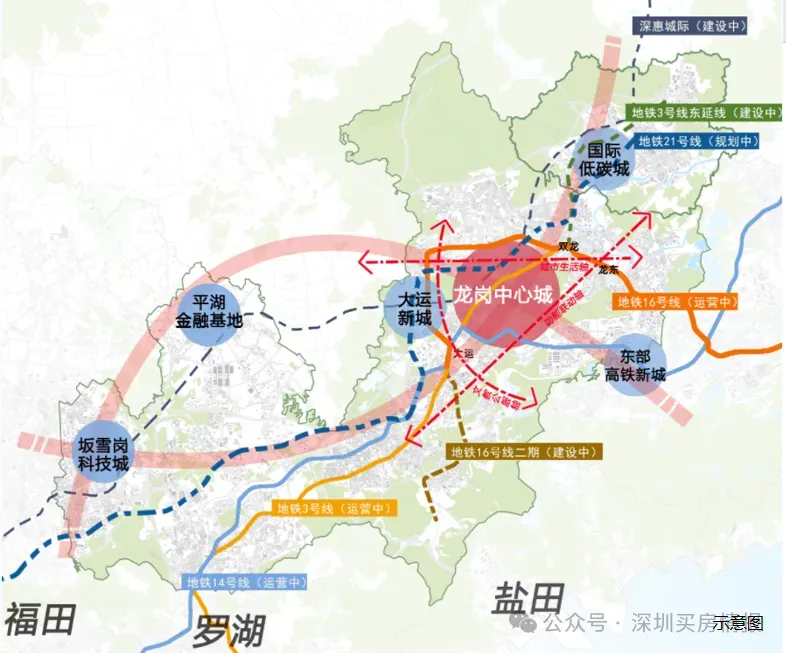 在龙岗发展一路向东的大趋势下,依托地铁3/16/14号线的轨道交通效能,“东部副中心”强势崛起,地铁16号线东轴方向成龙岗中心城外拓首站,“一芯两核多支点”战略赋能、超百万方城市更新推进,多重势能叠加,区域未来可期。
