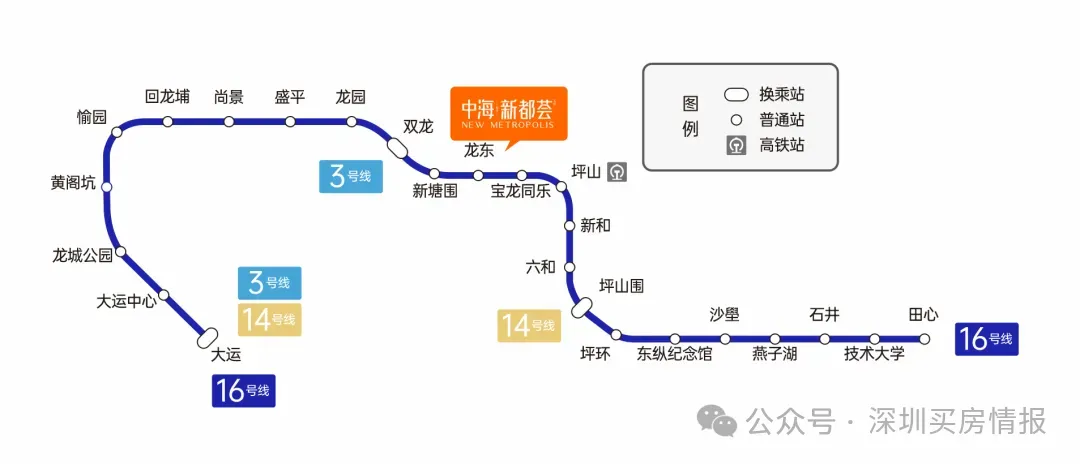 4站到龙岗中心城,大运站可换乘时速120KM/H的14号快线,直达罗湖、福田,2站直达坪山高铁站