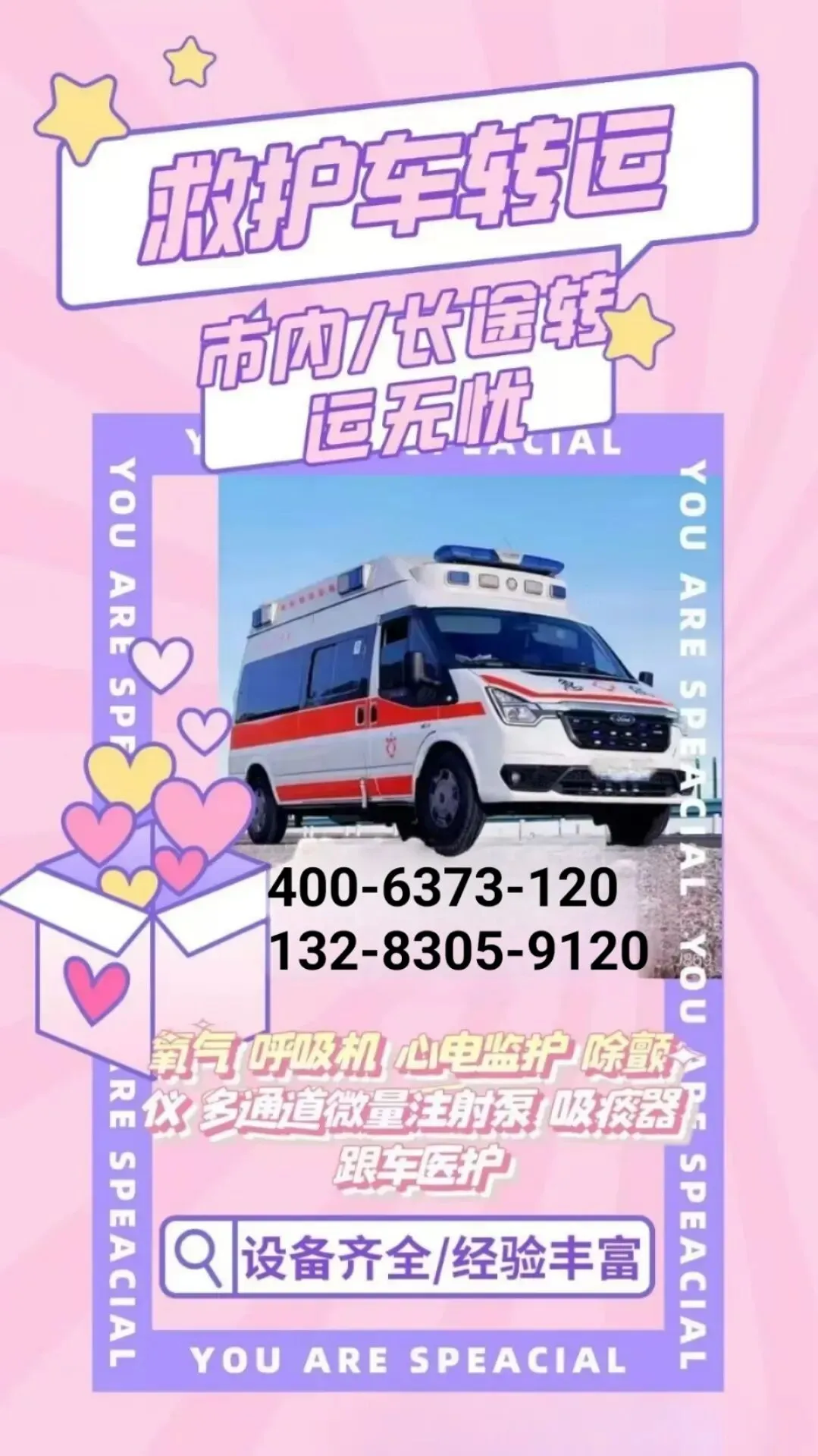 ✅ 全套急救设备:呼吸机、监护仪、氧气瓶等专业设备一应俱全,保障转运全程医疗需求