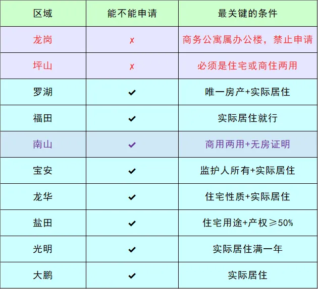 深圳10个区对公寓能不能上学的规定差得挺多,龙岗和坪山是明确不让公寓申请公办学位的,其他8个区虽然能申请,但条件和能拿到的积分都不一样。总的来说就是:住宅性质的公寓大多能申请,商务公寓得满足特定条件,而且积分普遍比住宅低。