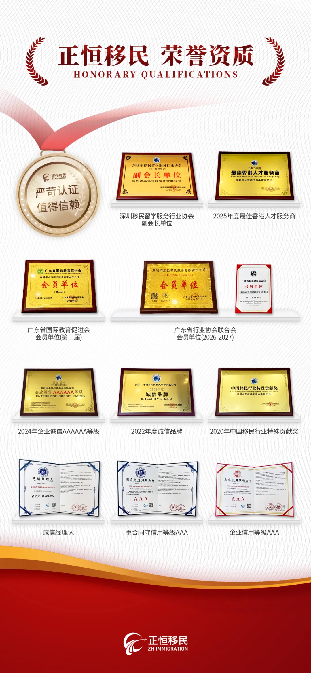 合规经营是正恒移民的立身之本。公司始终严格遵循行业规范与国家相关法律法规,坚守诚信服务底线,十一年间无一客户因违规操作被列入香港入境“限制申请名单”,以合规经营赢得了行业与客户的双重认可。凭借在诚信建设方面的突出表现,公司先后荣获 “企业信用等级AAA”、“重合同守信用等级AAA” 以及 “2024年企业诚信AAAAAA等级” 等权威认证,并被评为 “诚信品牌” 与 “诚信经理人” ,与深圳市移民留学服务行业协会“规范行业秩序、推动行业高质量发展、保障客户合法权益”的核心宗旨高度契合,这也是此次当选副会长单位的重要根基。
