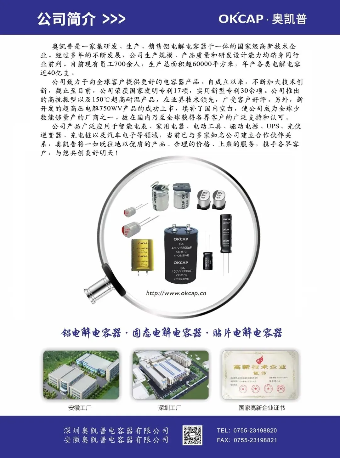 奥凯普电容器有限公司成立于2010年,是一家集研发、生产、销售铝电解电容器于一体的国家级高新技术企业。经过多年的不断发展,公司生产规模、产品质量和研发设计能力均跻身同行业前列。为进一步丰富及扩大产品线,2019年底,公司在安徽新设工厂,成立安徽奥凯普电容器有限公司,专注固态与贴片电解电容的研发与生产。月总产能增加至3亿余支。目前公司现有员工700余人,生产总面积约60000平方米,年产各类电解电容近40亿支。