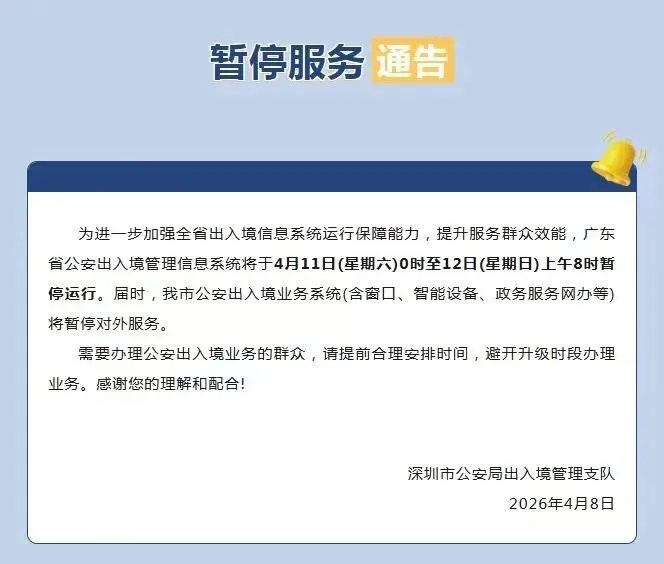 各位深港通勤、计划办证的朋友注意啦!深圳市公安局出入境管理支队发布重要通知:广东省公安出入境管理信息系统将于 4 月 11 日(周六)0 时至 4 月 12 日(周日)上午 8 时暂停运行,深圳全市出入境业务同步停摆,千万别跑空!