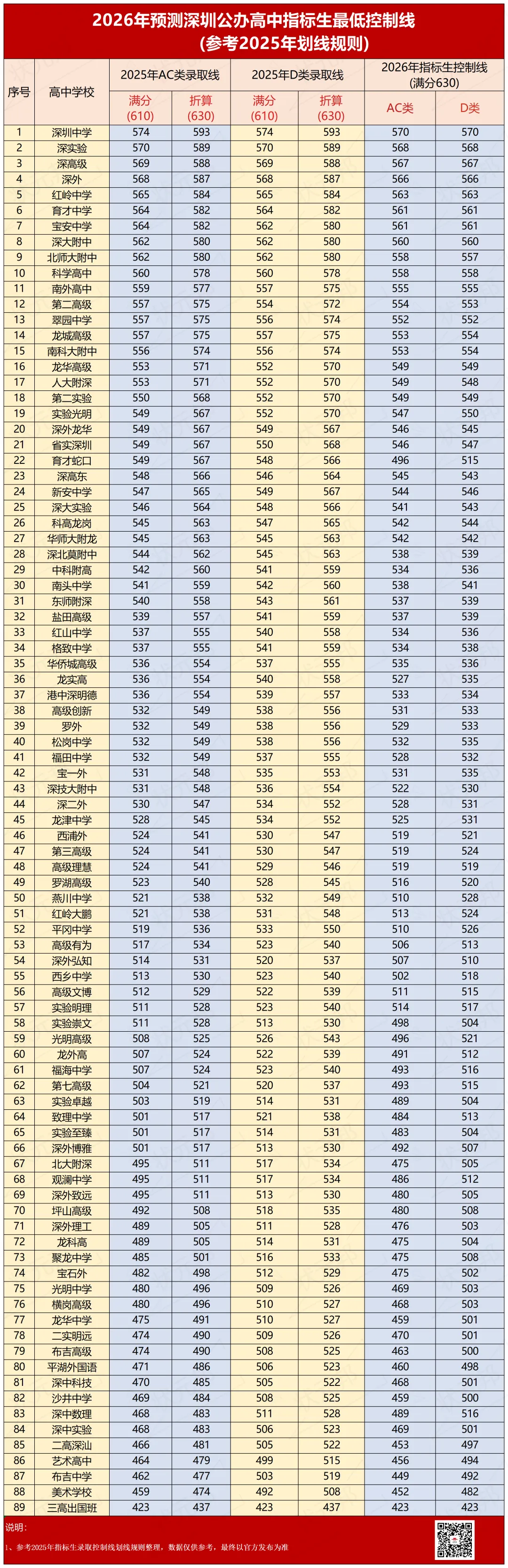 划线规则:预计2026年深圳市普通高中指标生录取控制线仍为参照前三年录取分数线平均值降20分的总体原则,一校一线确定。