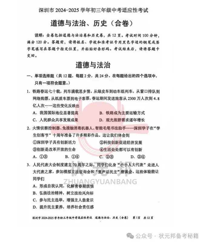 这边也准备好了往年适应性考试真题,免费供大家下载学习,家长同学们可重点关注其中历史、道法科目。