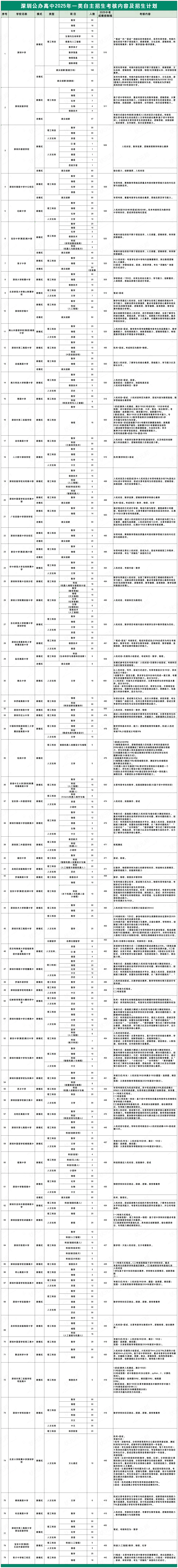 2025年深圳共有79所公办高中开设一类自招,各校具体的考核形式和考核内容,我们都给大家汇总整理好在下方表格啦,大家可以看看~