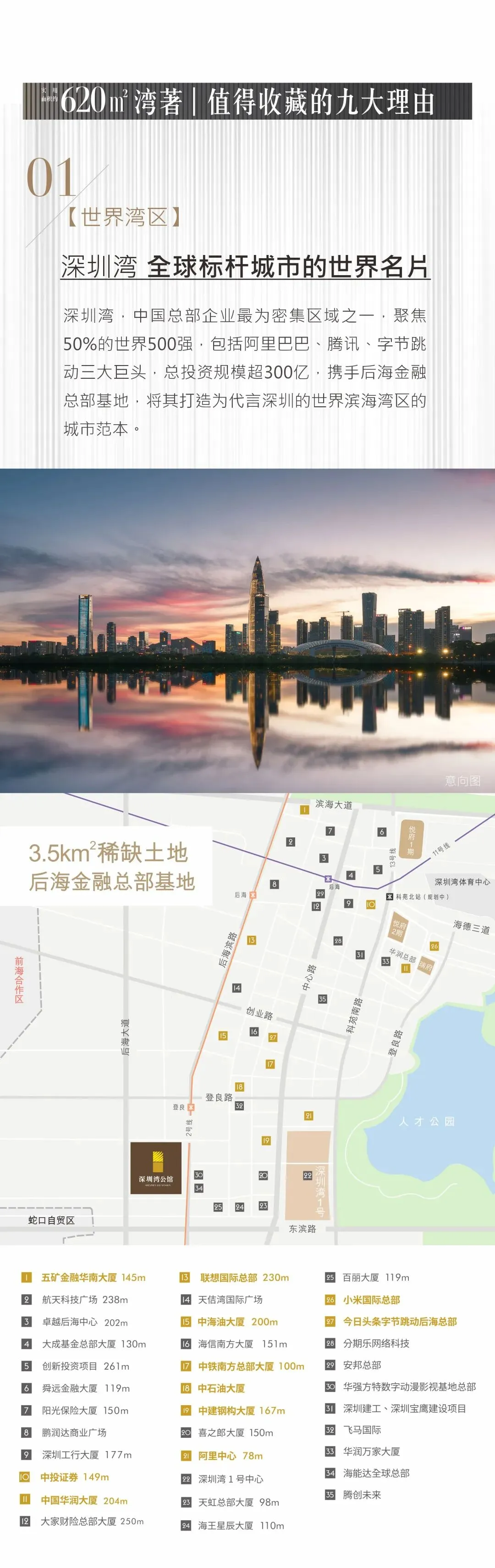 - 紧邻深圳湾超级总部基地,周边汇聚腾讯、阿里、华为等80余家企业总部,形成百亿级企业总部集群,以金融、科技、文化等产业为主导。