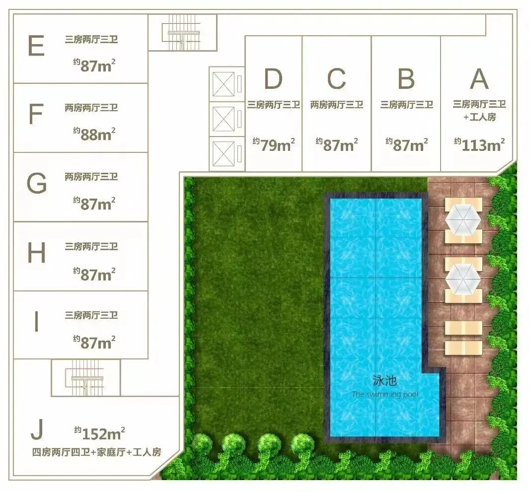 - 户型面积:79㎡、87-88㎡、113㎡、152㎡(复式设计,实用面积126-206㎡)
