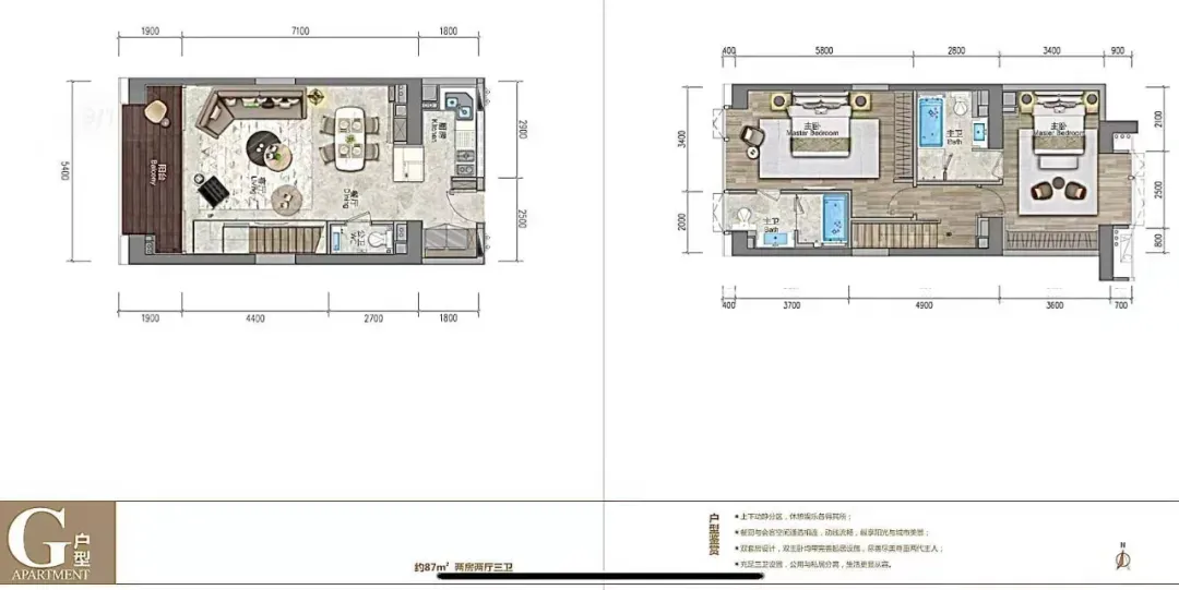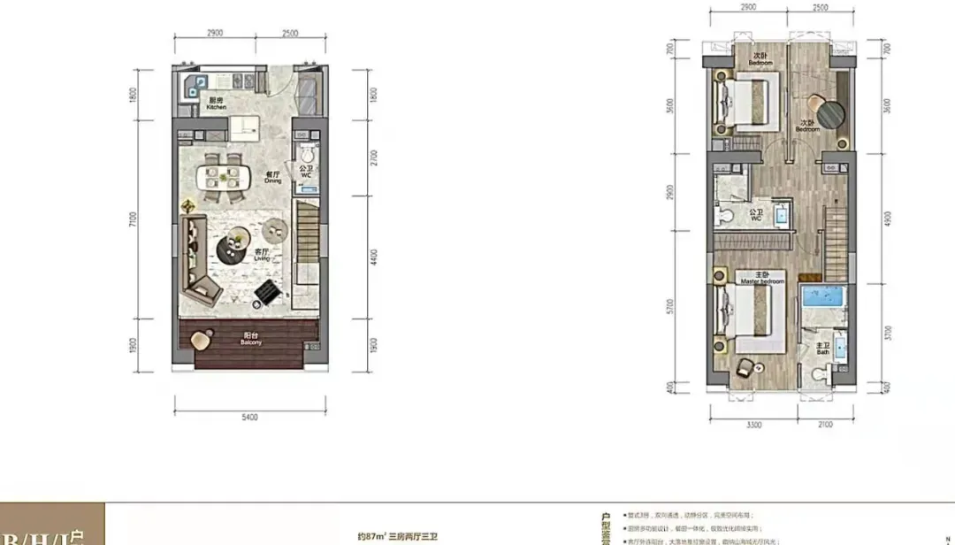 - 79㎡:三房两厅三卫,南北通透,复式设计,下层为餐厨客厅,上层为私密卧房,实用面积约129㎡。