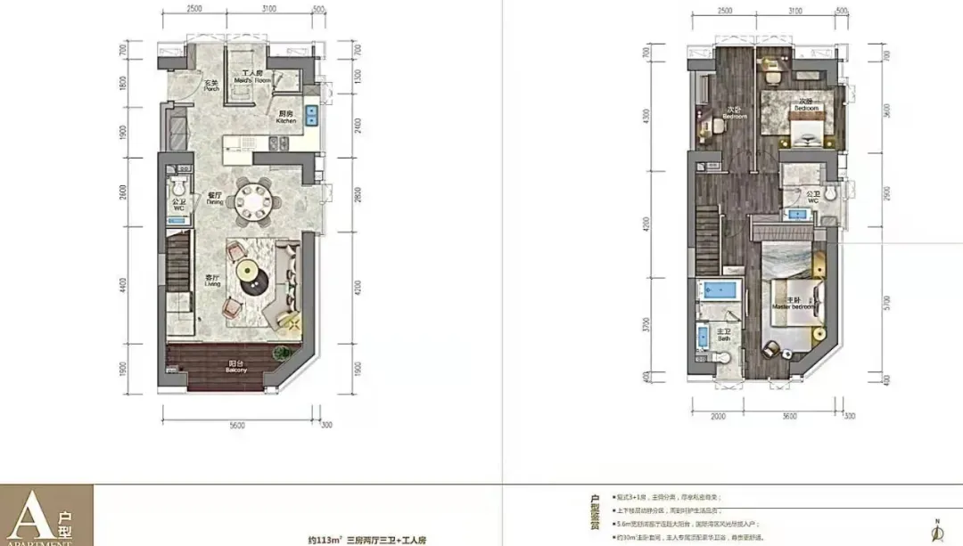 - 113㎡:三房两厅三卫+工人房,南北通透三面景观,客厅与主卧开间5.6米,实用面积约148㎡。