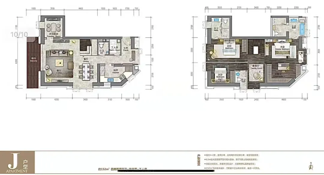 - 152㎡:四房两厅四卫+家庭厅+工人房,双向通透三面采光,客厅开间6.3米,实用面积约206㎡。