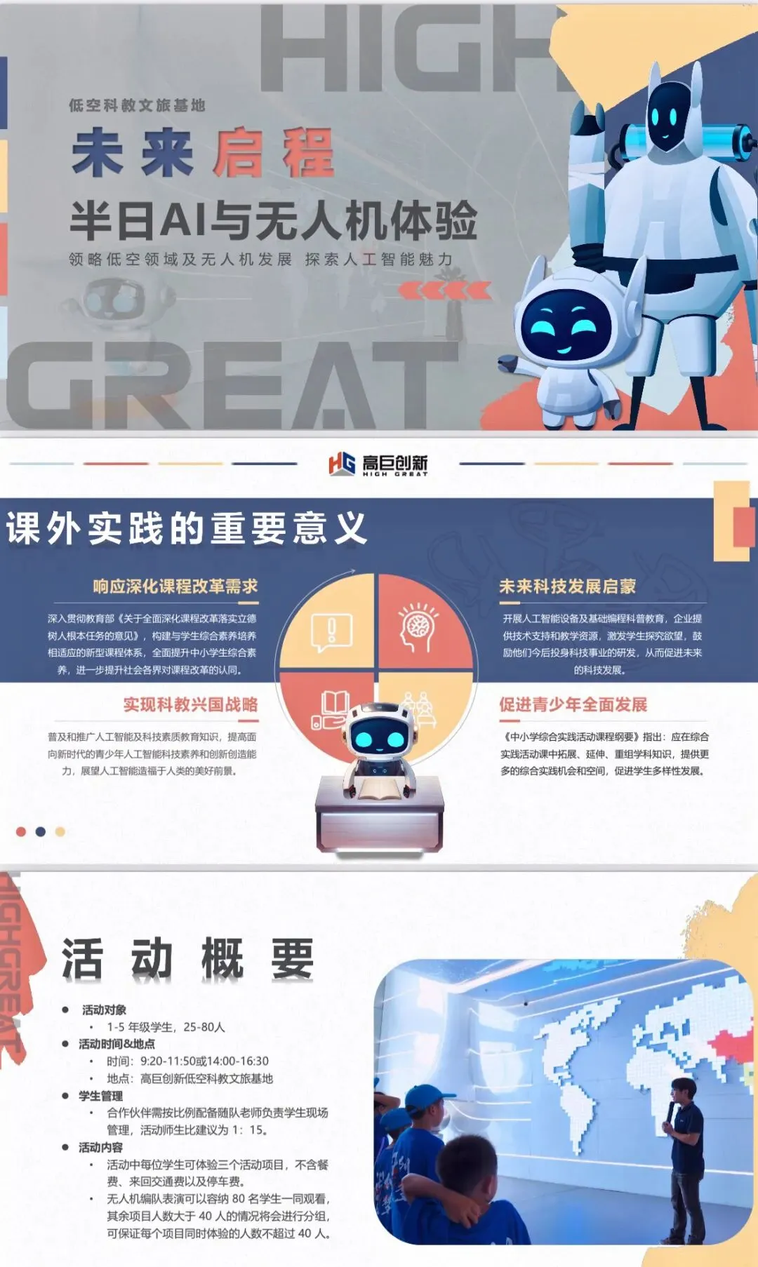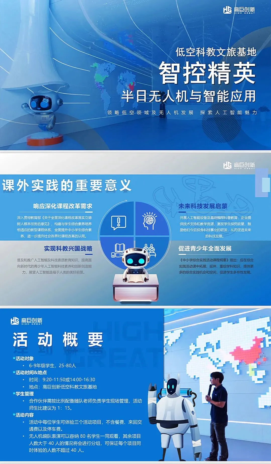 在这个科技飞速发展的时代,让孩子尽早接触前沿科技、培养创新思维,是每个教育者和家长的责任与期待。深圳高巨创新低空科教文旅基地的半日与一日研学项目,正是这样一扇通往未来的窗口。
